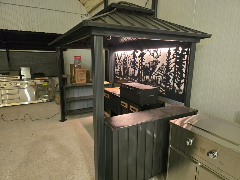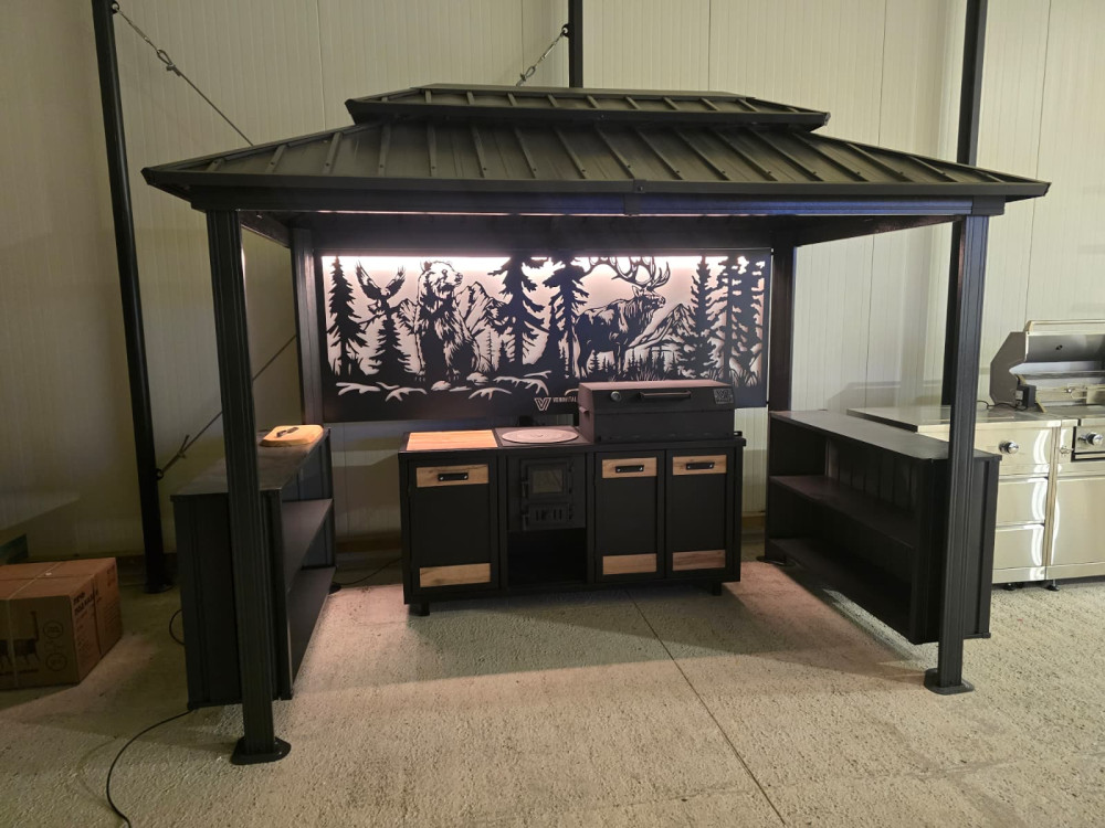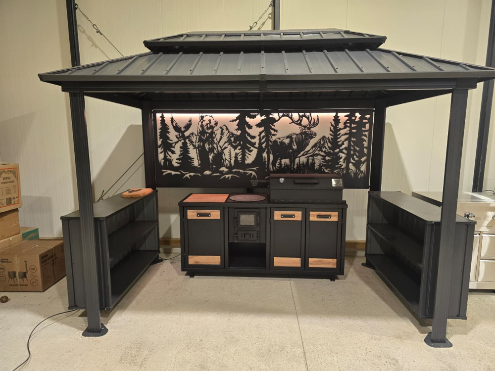 Metāla nojume grilam ar aizmugurejo LED paneli. Laba kvalitāte, stabila un izturīga konstrukcija. Cinkots metāls, krāsots pulverkrāsā. Nojume pārdodas izjauktā veidā ar komplektēšanas instrukciju. Panelis aprīkots ar LED apgaismojumu, kas paredzēts lietošanai ārpus telpām.