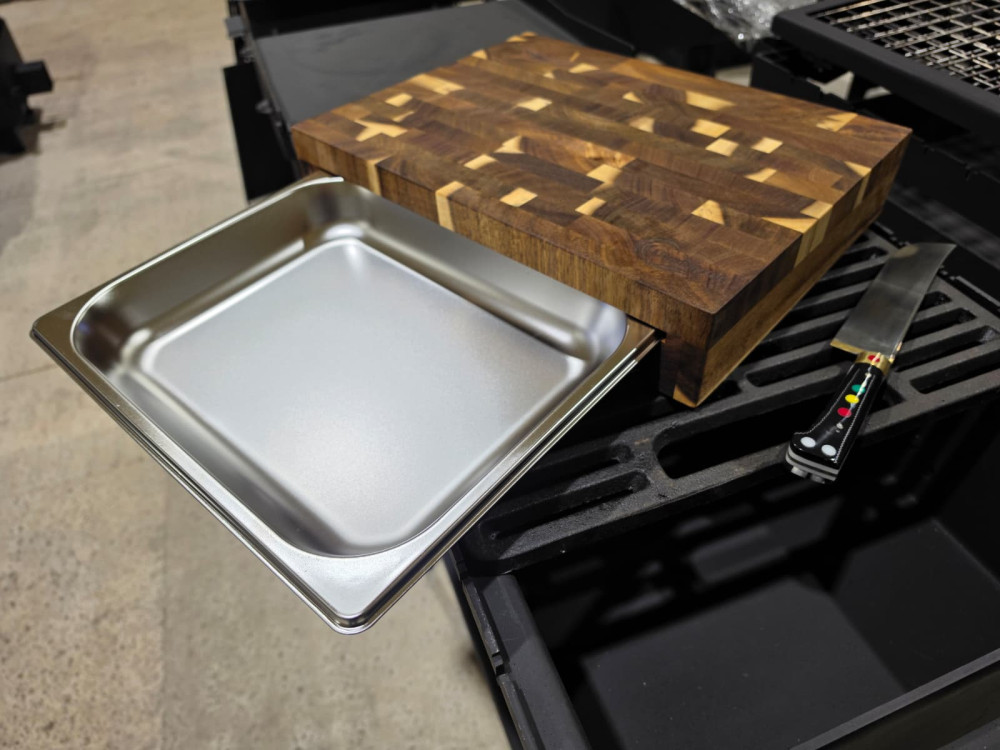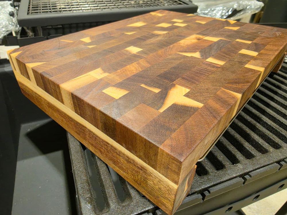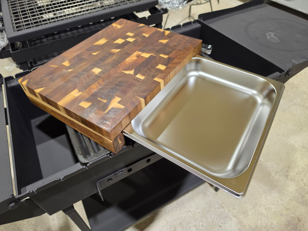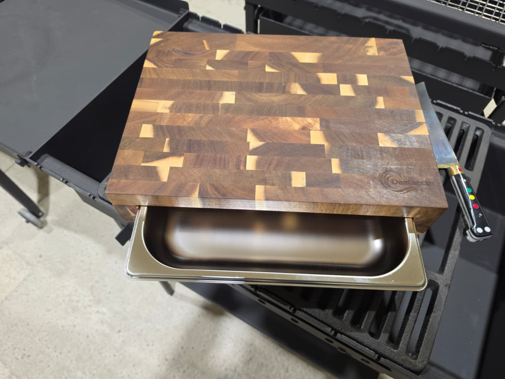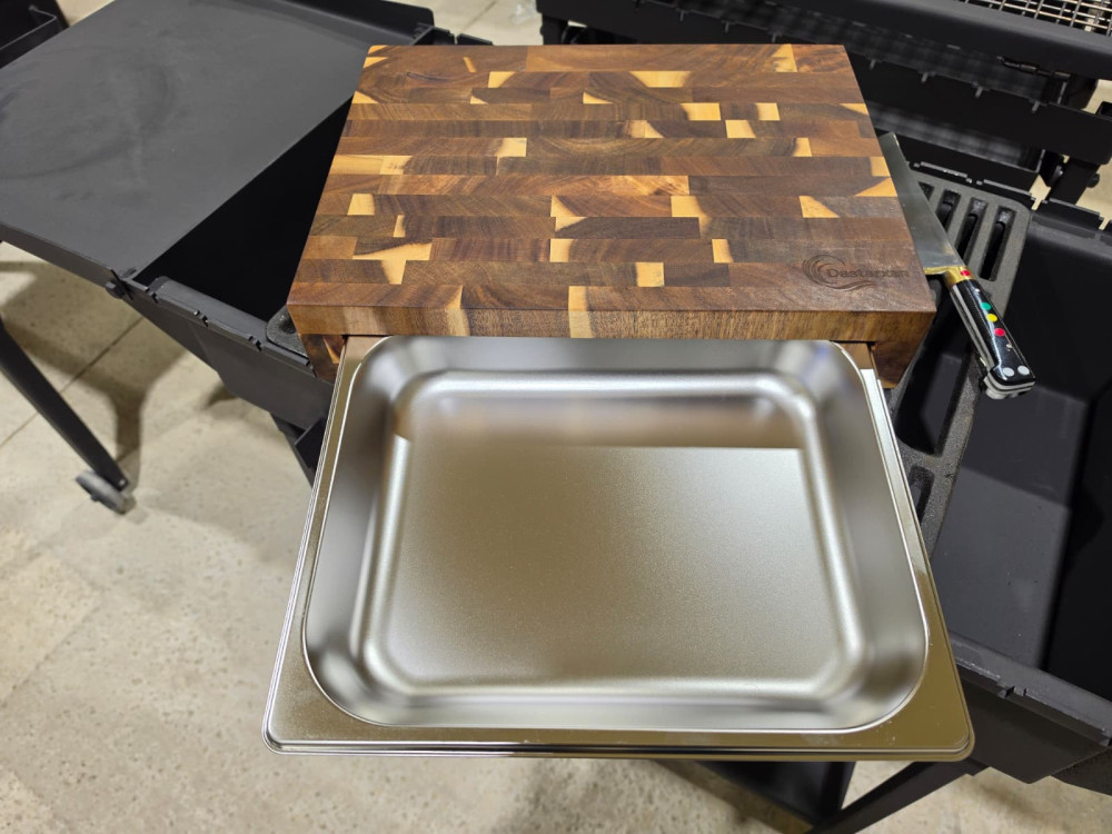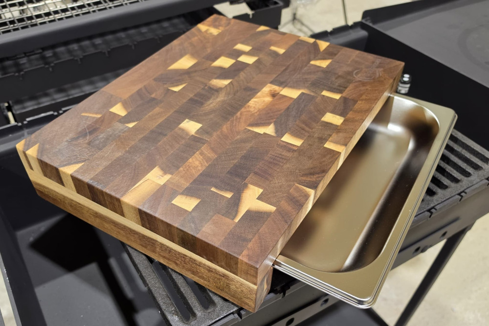 Izturīgs akācijas griešanas dēlis ar dziļu paplāti no 304. nerūsējoša tērauda. Piemērots visa veida produktiem: gaļai, dārzeņiem, sulīgiem produktiem, riekstiem...