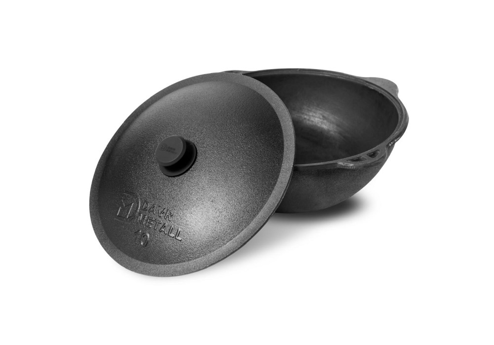 Čuguna uzbeku kazans 10l - kvalitatīvs, oriģināls, slīpēts kazans. Cieši pieguļošs alumīnija vāks ar silikona rokturi.
