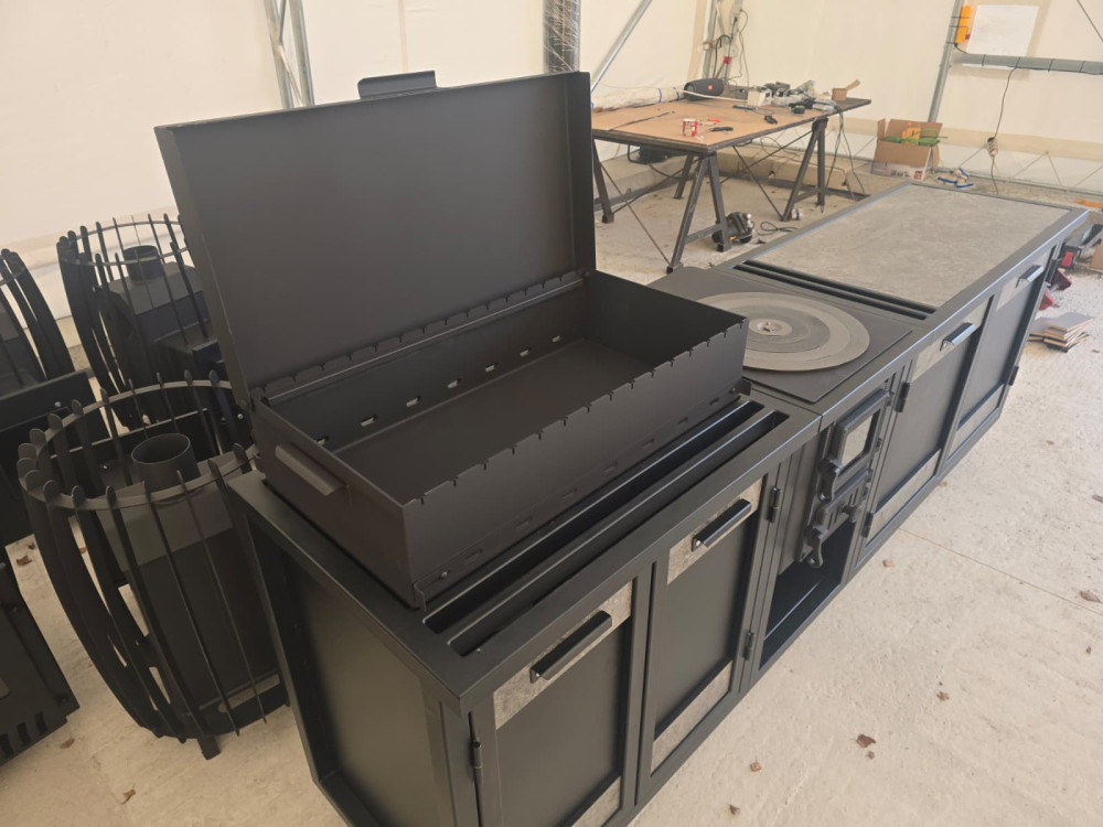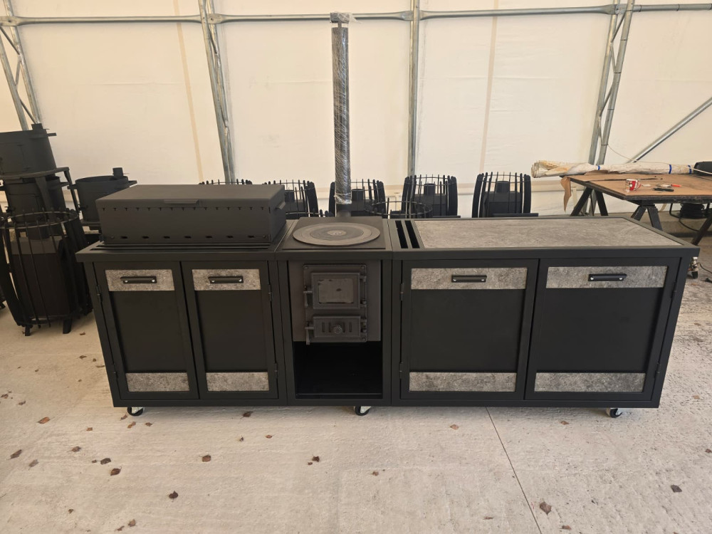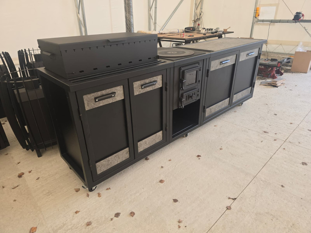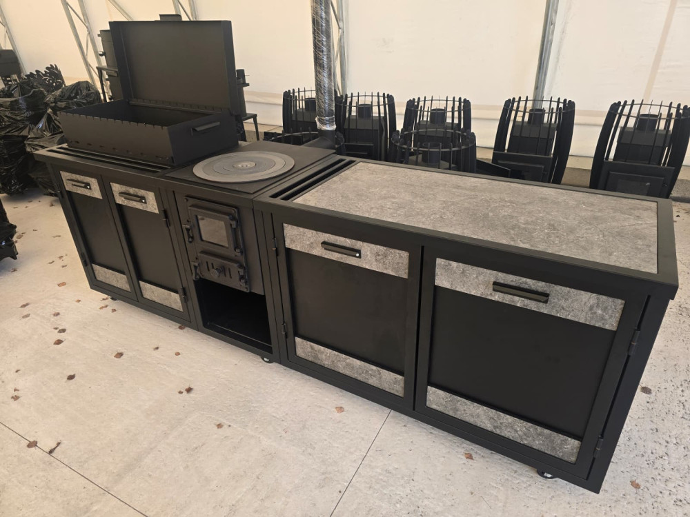 Virtuve sastāv no 3. moduļiem - krāsns, grils un darba virsma. Krāsota pulverkrāsā.