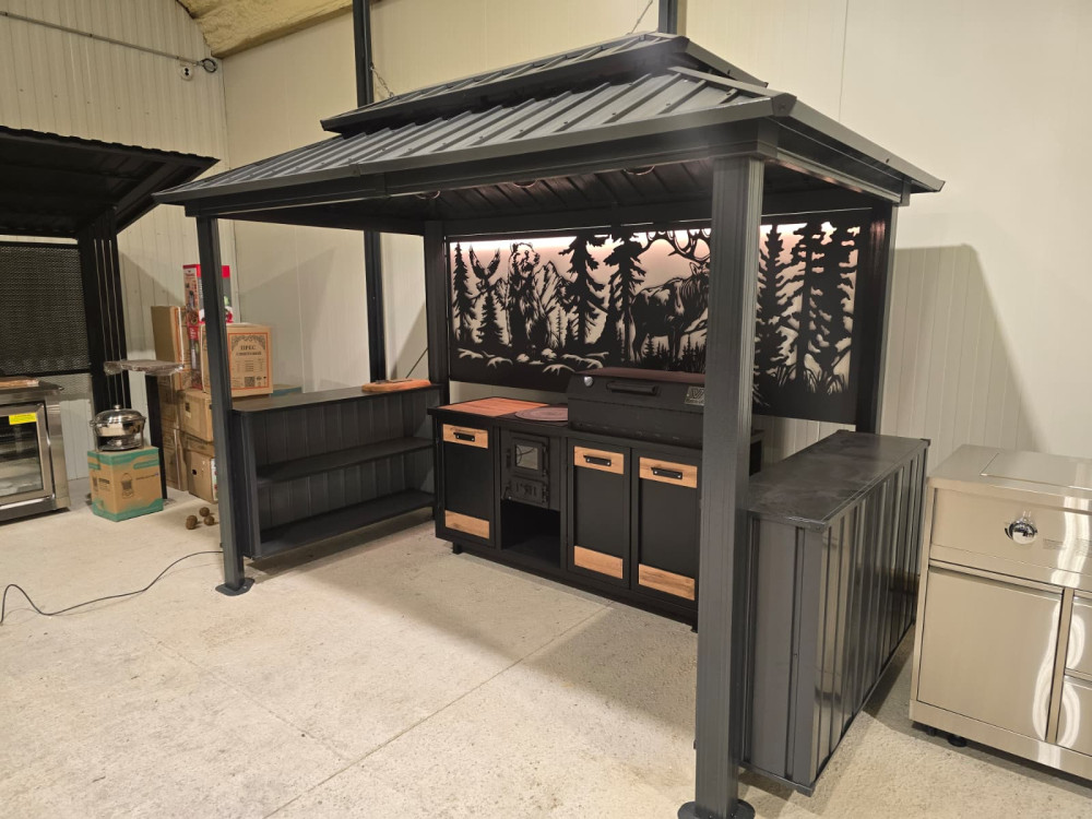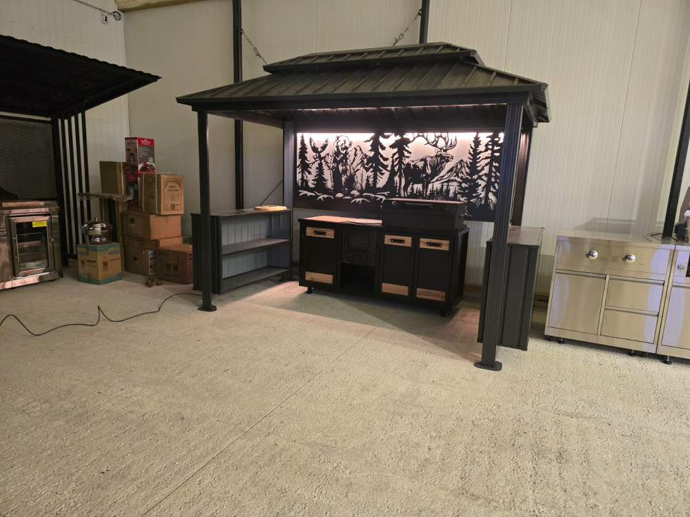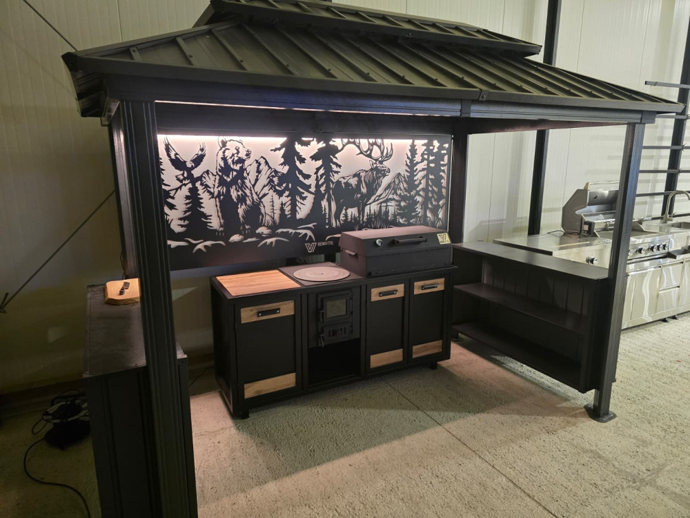 Metāla nojume grilam ar aizmugurejo LED paneli. Laba kvalitāte, stabila un izturīga konstrukcija. Cinkots metāls, krāsots pulverkrāsā. Nojume pārdodas izjauktā veidā ar komplektēšanas instrukciju. Panelis aprīkots ar LED apgaismojumu, kas paredzēts lietošanai ārpus telpām.
