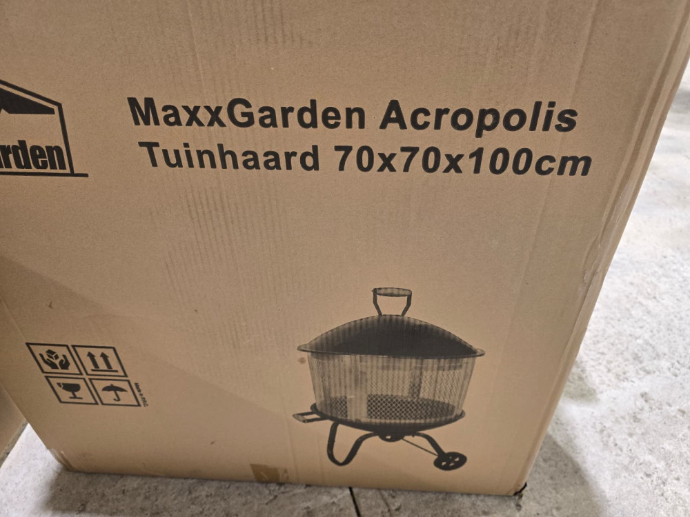 Apaļa ugunskura vieta ar sietu un vāku, ērta lapu dedzināšanai. Ir rokturis un riteņi ērtai pārvietošanai.